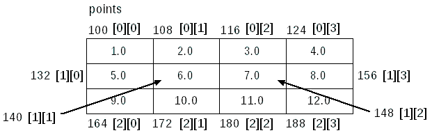 Expression Type points an array of 3 arrays of 4 doubles. &points the address of (pointer to) an array of 3 arrays of 4 doubles. &points[0] the address of (pointer to) an array of 4 doubles (the first row). &points[0][0] the address of (pointer to) a double (the first double in the first row).