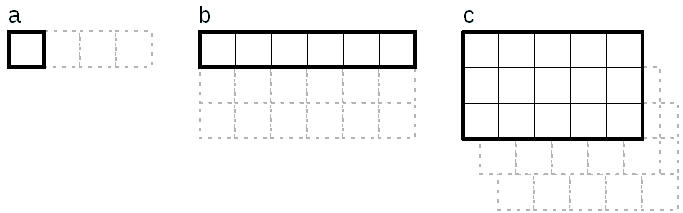 int a; /* int */ int b[10]; /* array of 10 int */ int c[5][10]; /* array of 5 arrays of 10 int */ int d[3][5][10]; /* array of 3 arrays of 5 arrays of 10 int */ int e[10][5][3]; /* array of 10 arrays of 5 arrays of 3 int */