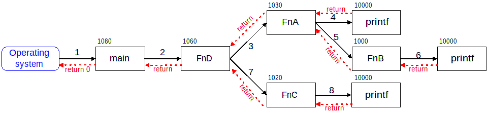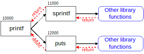 (other code)void FnB(void) 1000: { 1004: printf("tied the room "); 1008: } void FnC(void) 1020: { 1024: printf("together\n"); 1028: } void FnA(void) 1030: { 1034: printf("That rug really "); 1038: FnB(); 1042: } void FnD(void) 1060: { 1064: FnA(); 1068: FnC(); 1072: } int main(void) 1080: { 1084: FnD(); 1088: return 0; 1092: }void FnB(void) 1000: { 1004: push "tied the room " onto stack jump to 10000 1008: } return void FnC(void) 1020: { 1024: push "together\n" onto stack jump to 10000 1028: } return void FnA(void) 1030: { 1034: push "That rug really " onto stack jump to 10000 1038: jump to 1000 1042: } return void FnD(void) 1060: { 1064: jump to 1030 1068: jump to 1020 1072: } return int main(void) 1080: { 1084: jump to 1060 1088: return 0; 1092: }int printf(string, ...) 10000: { 10004: push string onto the stack jump to 11000 jump to 12000 10008: } return int sprintf(string, ...) 11000: { 11004: format what is on the stack 10008: } return int puts(string) 12000: { 12004: print what is on the stack 12008: } return
