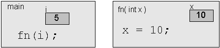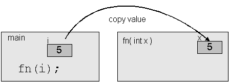 #include <stdio.h> /* printf */ void fn(int x) { printf("In fn, before assignment, x is %i\n", x); x = 10; printf("In fn, after assignment, x is %i\n", x); } int main(void) { int i; i = 5; printf("Before call: i is %i\n", i); fn(i); /* call site */ printf("After call: i is %i\n", i); return 0; } Output: Before call: i is 5 In fn, before assignment, x is 5 In fn, after assignment, x is 10 After call: i is 5