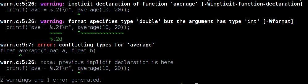 warn.c:5:26: note: previous implicit declaration of 'average' was here
