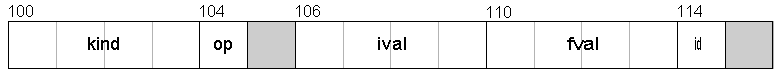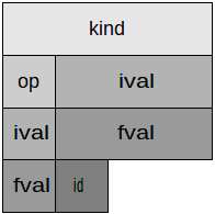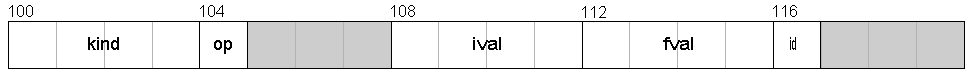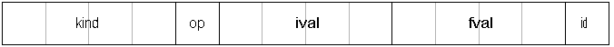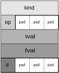 Butsizeof(sym1.kind) = 4 sizeof(sym1.op) = 1 sizeof(sym1.ival) = 4 sizeof(sym1.fval) = 4 sizeof(sym1.id) = 1 sizeof(sym1) = 20