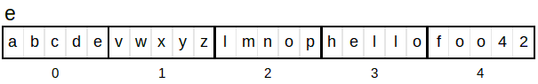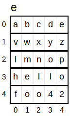 You access each character using two subscripts: e[row][column] where row and column are integers between 0 and 4. For example, the letter z would be accessed as e[1][4].![]()