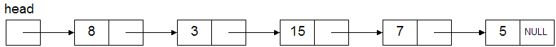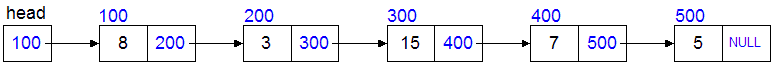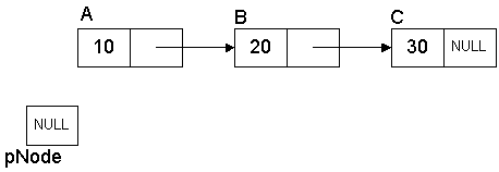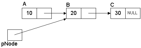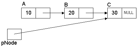 could be visualized as this:// #1 Declare 3 structs Node A, B, C; // #2 Set the 'data' portions of the nodes A.number = 10; B.number = 20; C.number = 30; // #3 Connect (link) the nodes together A.next = &B; // A's next points to B B.next = &C; // B's next points to C C.next = 0; // Nothing follows C