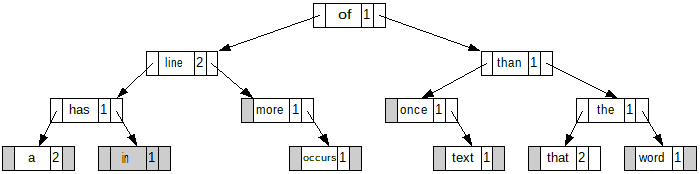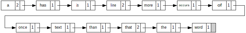 Before implementing this algorithm with an STL container, how would you implement it without using any STL containers? In other words, using only arrays, linked-lists, or other data structure that you might invent. (In other words, do it in C.) Keep in mind that the file could be any size, so hard-coding anything is out of the question.2 a 1 has 1 in 2 line 1 more 1 occurs 1 of 1 once 1 text 1 than 2 that 1 the 1 word