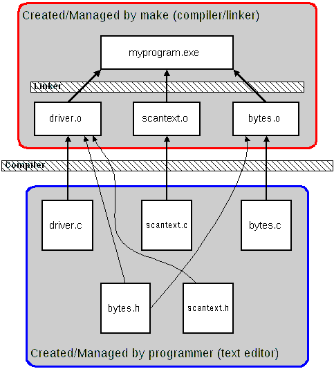 We are going to create an executable named myprogram.exe using 3 source files: driver.c, bytes.c, and scantext.c and this is the dependency diagram: