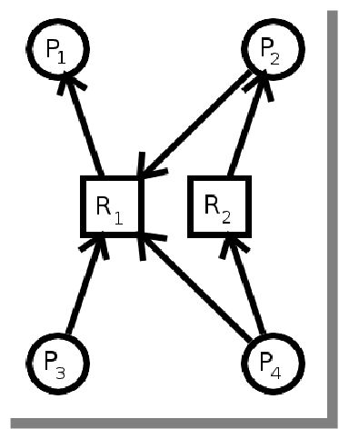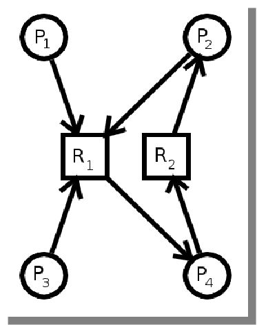 - Circular waiting - process P0 is waiting for process P1 to release a resource, P1 is waiting for P2, ... , Pn is waiting for P0