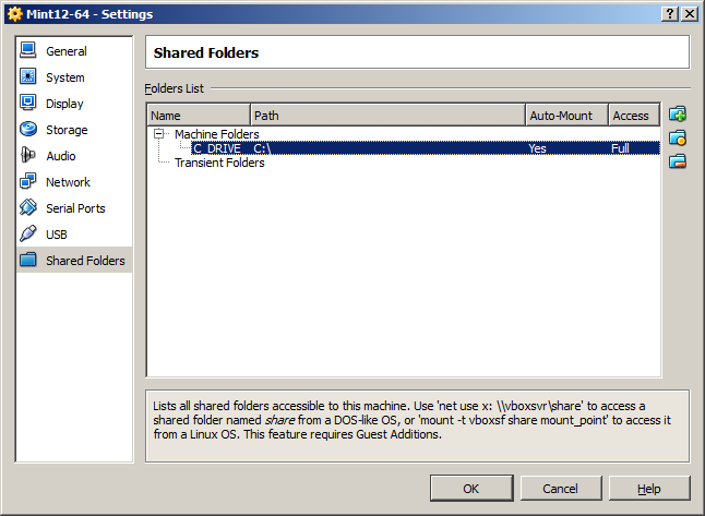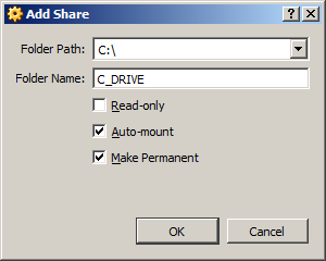 I've selected to share the entire C: drive in Windows. When you click OK, you have a chance to name the share. By default, it is named C_DRIVE which is adequate for our purposes. I also check Auto-mount and Make Permanent for ease-of-use, as I want this to happen automatically each time the guest OS is booted.![]()