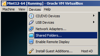 We would like the host and guest operating systems to be able to share files. We can do this by using Shared Folders. In the running virtual machine, choose the Devices menu, then choose Shared Folders:Note: In these examples, the host operating system is Windows 7 Professional 64-bit and the guest is Linux Mint 12 64-bit. The Virtual Box software looks very similar on all platforms, but you may detect some differences from the screen shots below.