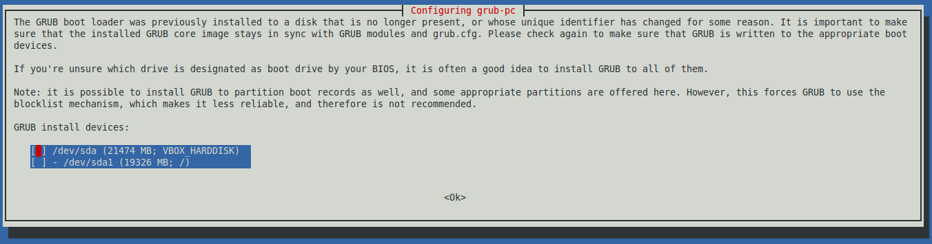 Select the first option (press the spacebar), then press TAB to move to the <Ok> and press Enter. This message is something that I've only occasionally seen.