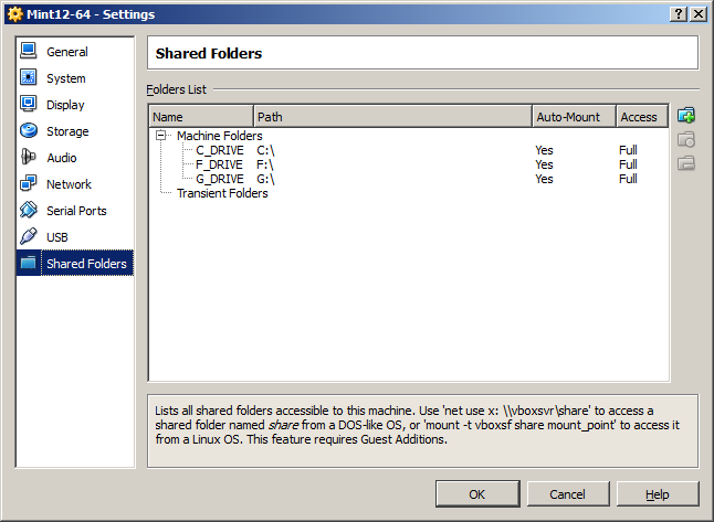 sudo mount -t vboxsf C_DRIVE /home/mmead/Windows/C sudo mount -t vboxsf F_DRIVE /home/mmead/Windows/F sudo mount -t vboxsf G_DRIVE /home/mmead/Windows/G