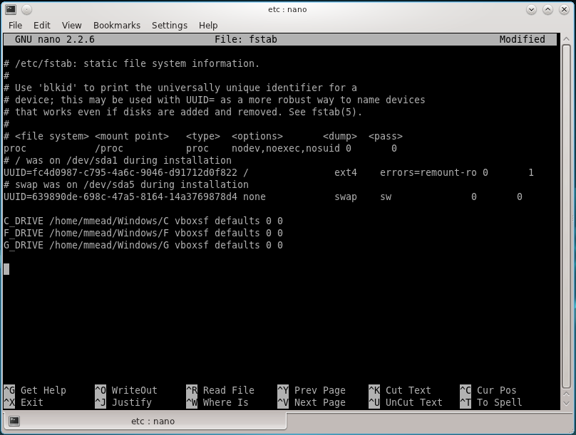 Now, every time the guest OS boots, the Windows shares will be mounted. The screen shot below shows the actual fstab file on the guest OS:C_DRIVE /home/mmead/Windows/C vboxsf defaults 0 0 F_DRIVE /home/mmead/Windows/F vboxsf defaults 0 0 G_DRIVE /home/mmead/Windows/G vboxsf defaults 0 0