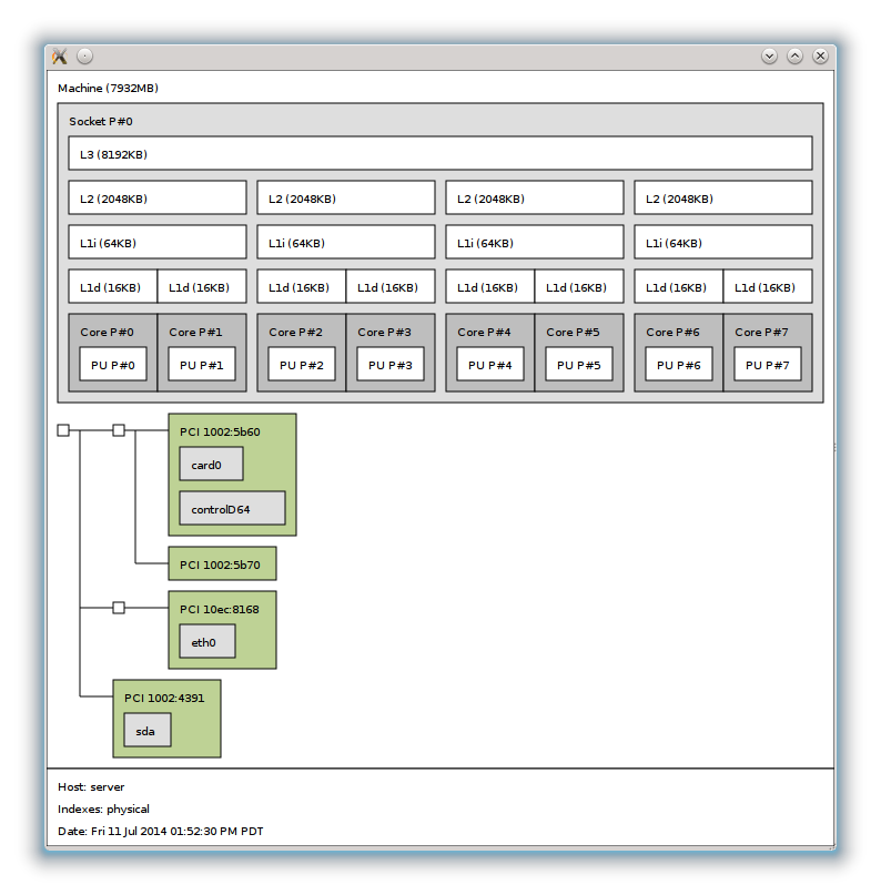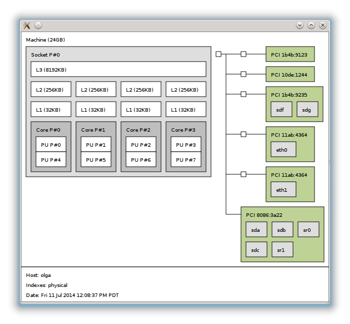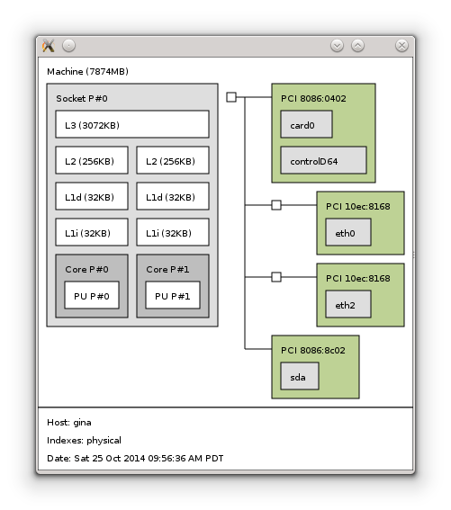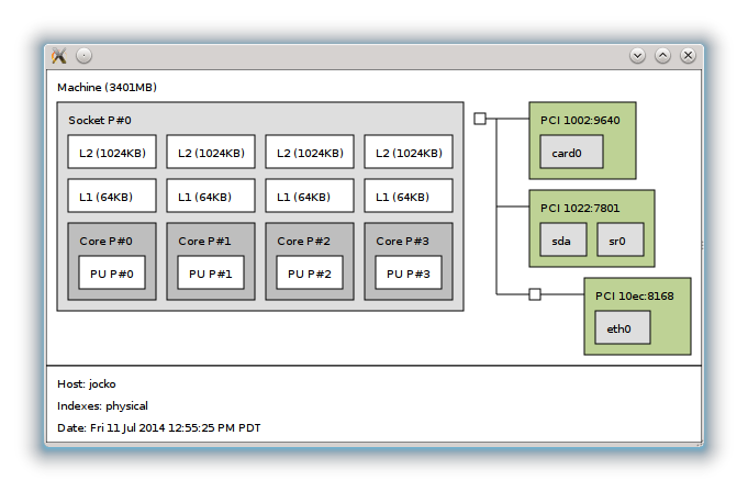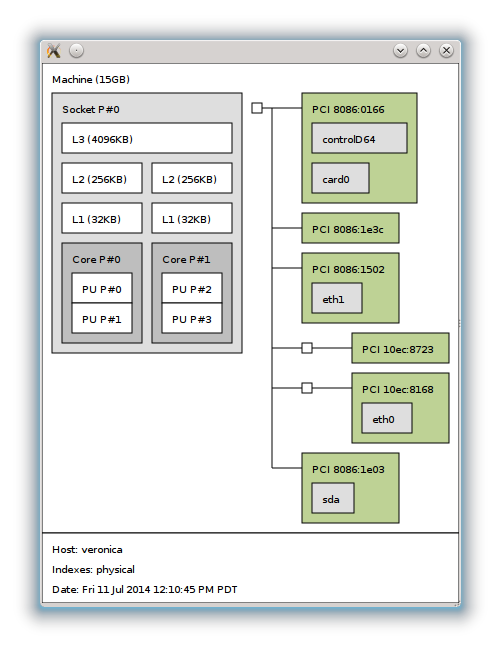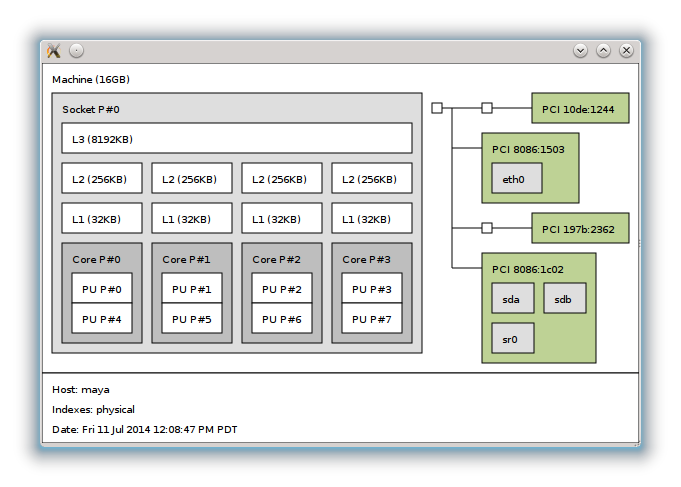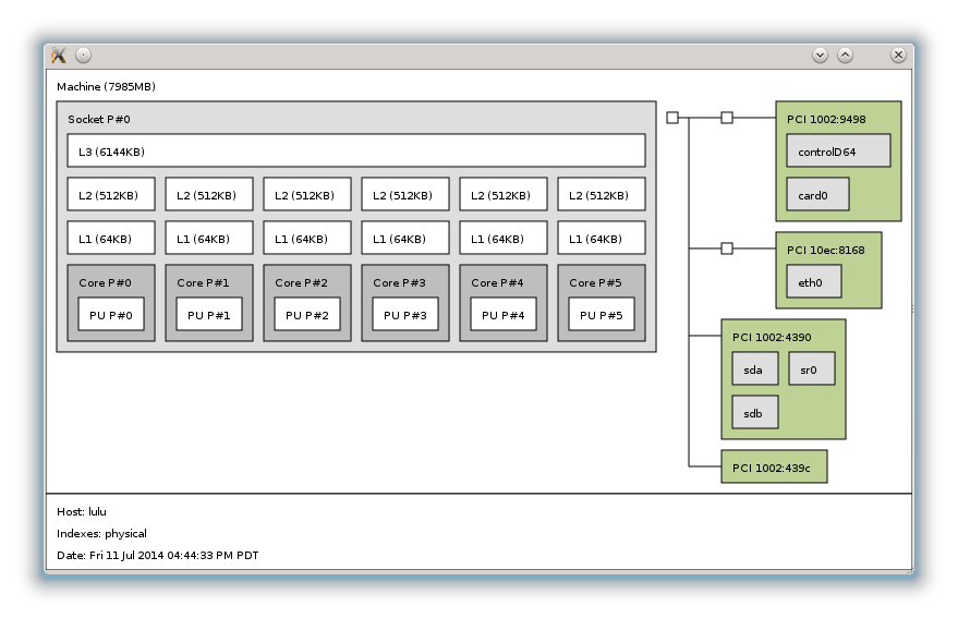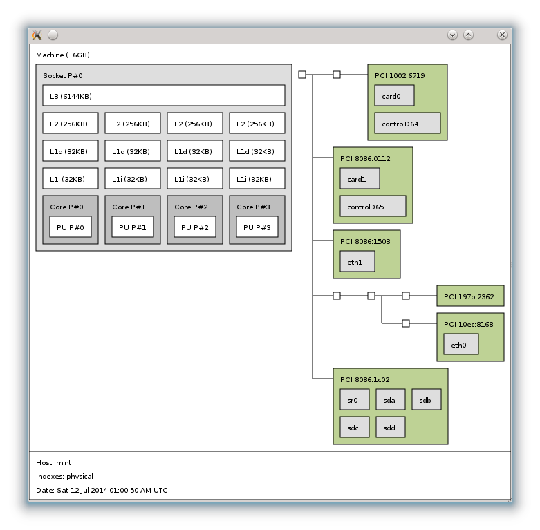 These screenshots were generated by a program called lstopo (that's a lowercase 'L' and lowercase 'O's, not zeros) and it is part of the Portable Hardware Locality (hwloc) project. To install in Debian-based systems (e.g. Ubuntu and Mint):And you're good-to-go.sudo apt-get install hwloc