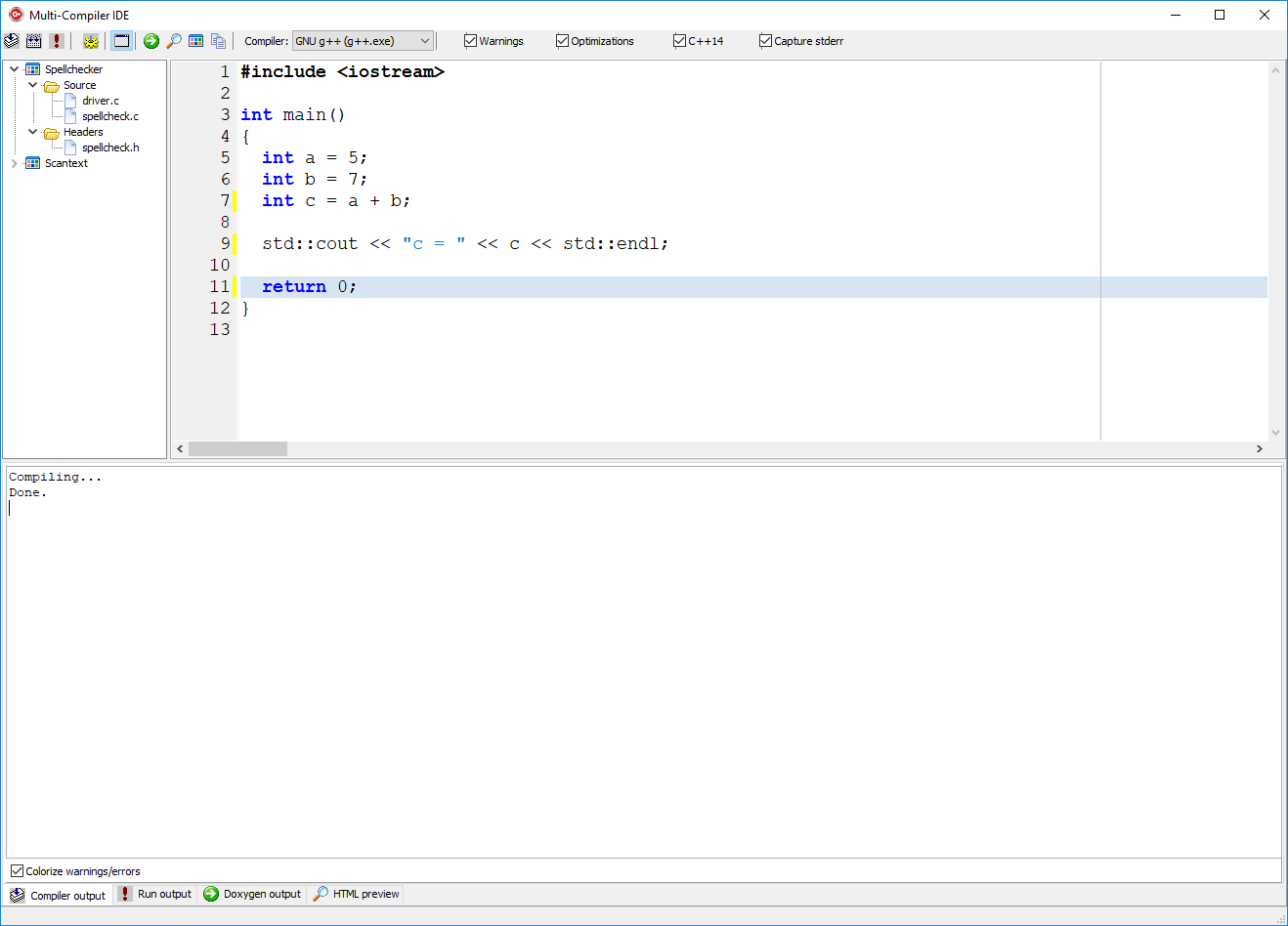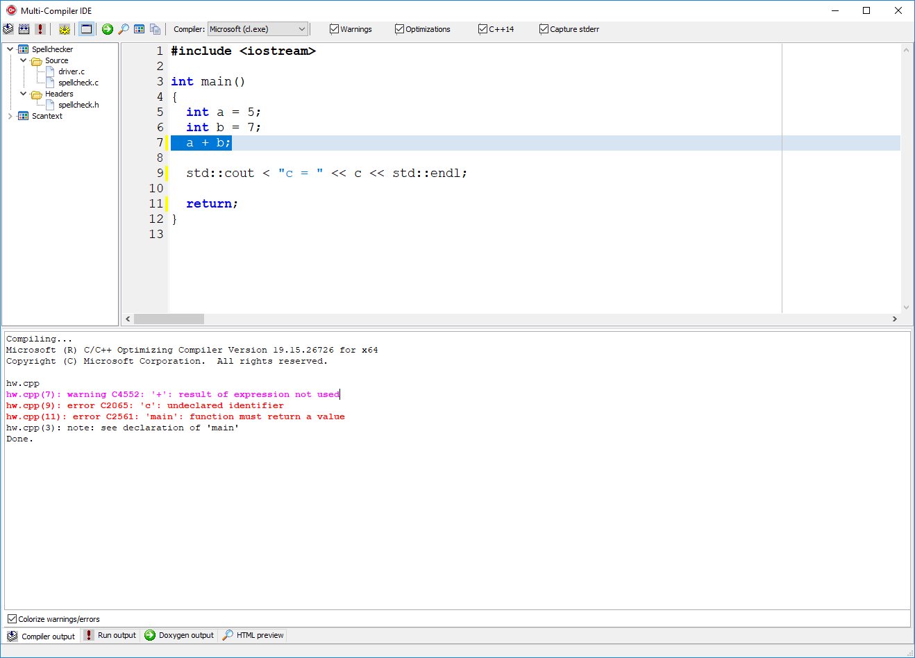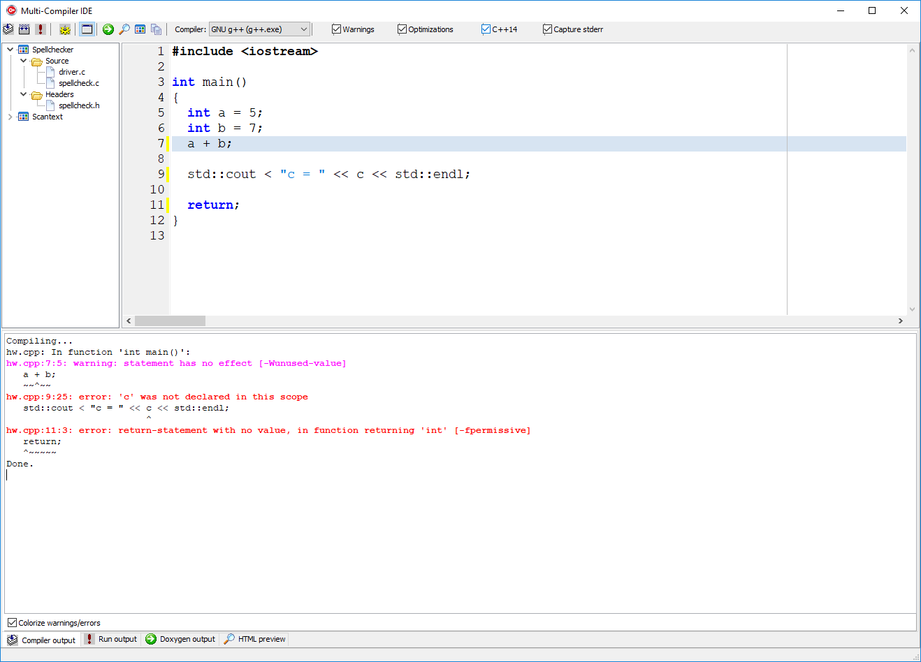 Building the code using GNU g++ (with warnings/errors). The command-line compiler (cl.exe, gcc.exe, clang.exe, etc.) is run as a child process and its output is redirected (piped) back to the GUI, which displays it in the bottom window in the tab labeled Compiler output. Clicking the mouse on the error message in the bottom window will highlight the line in the source code in the top window.