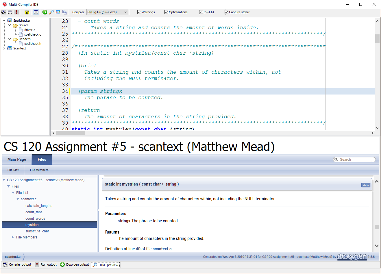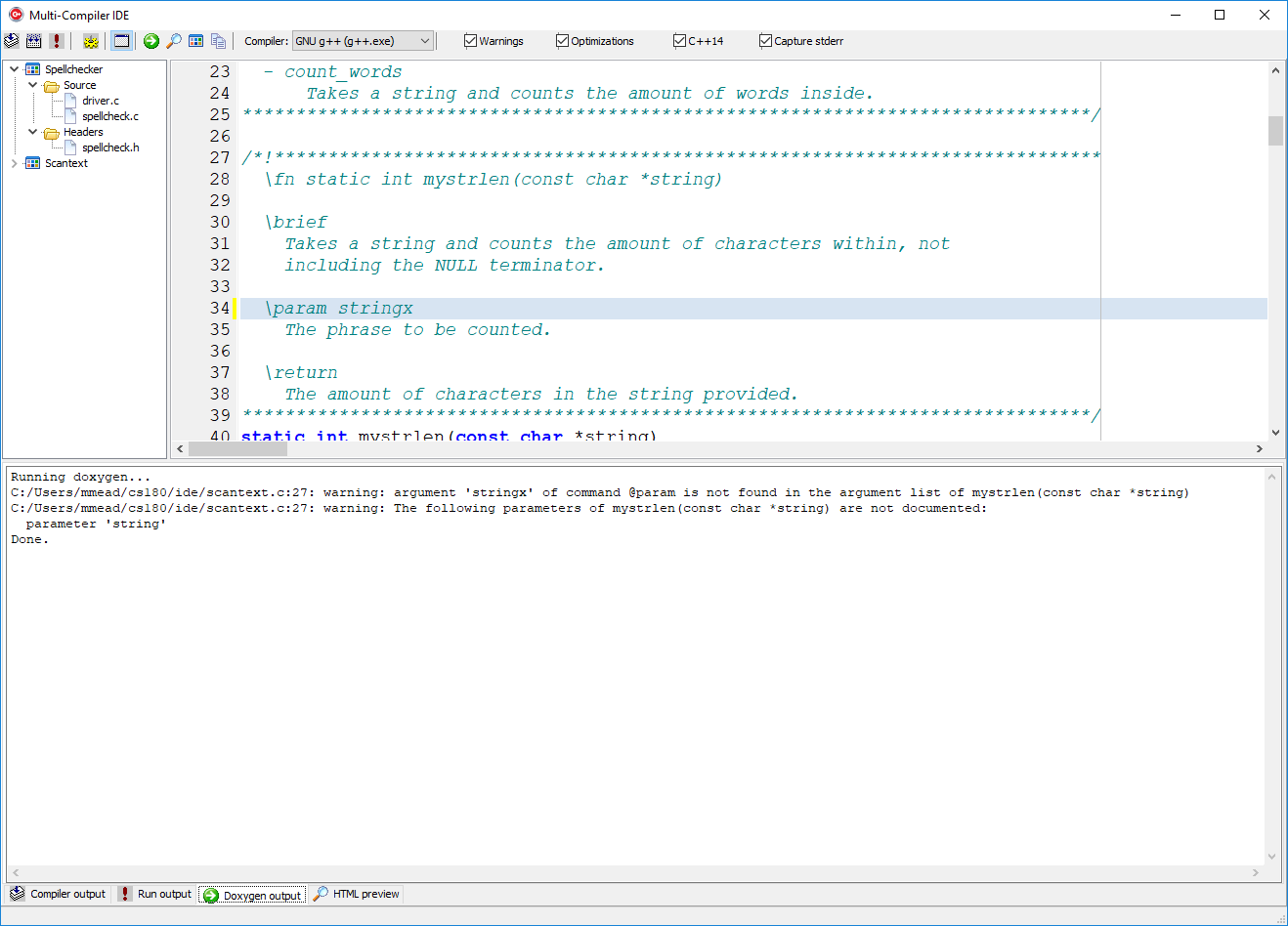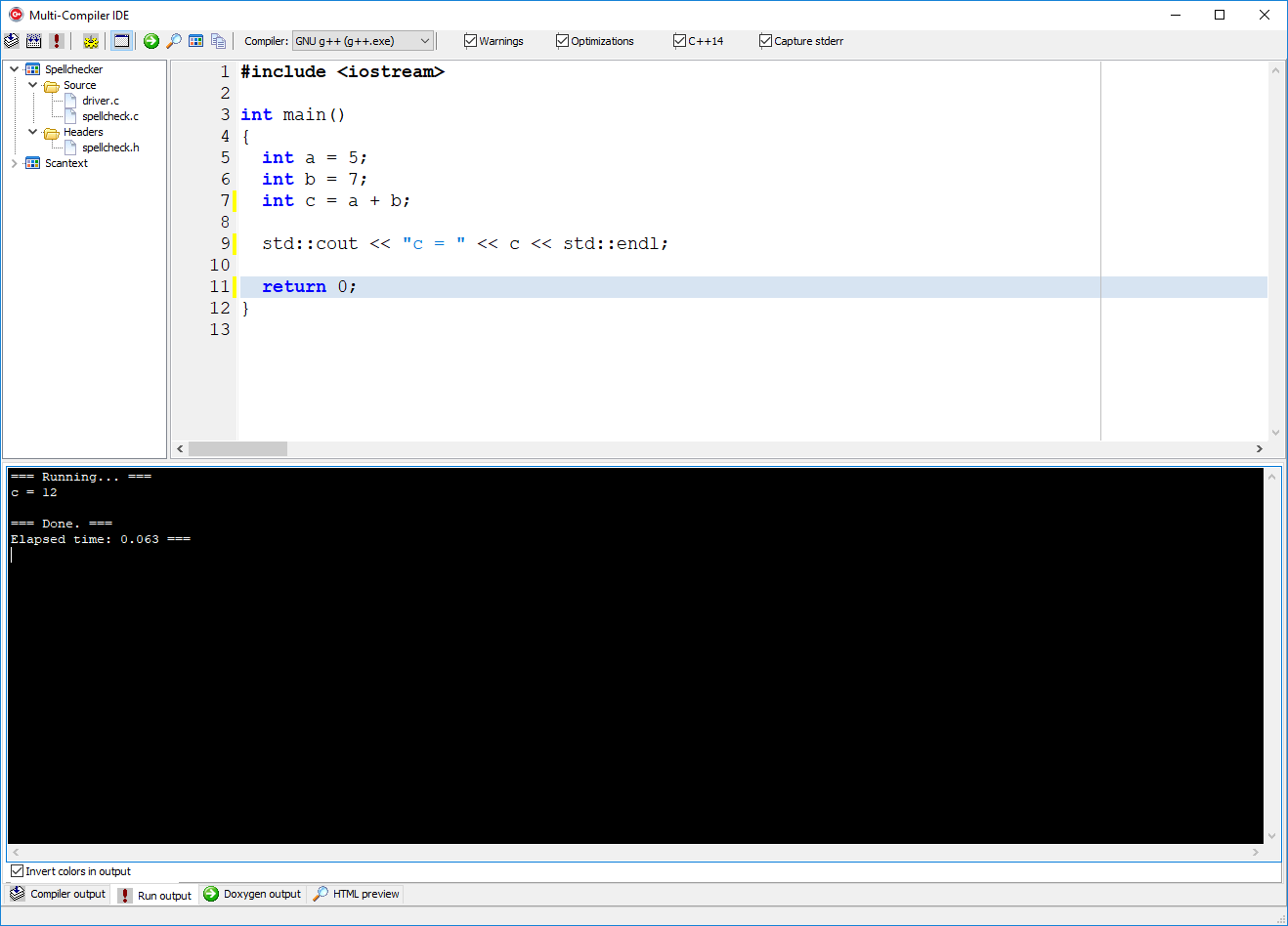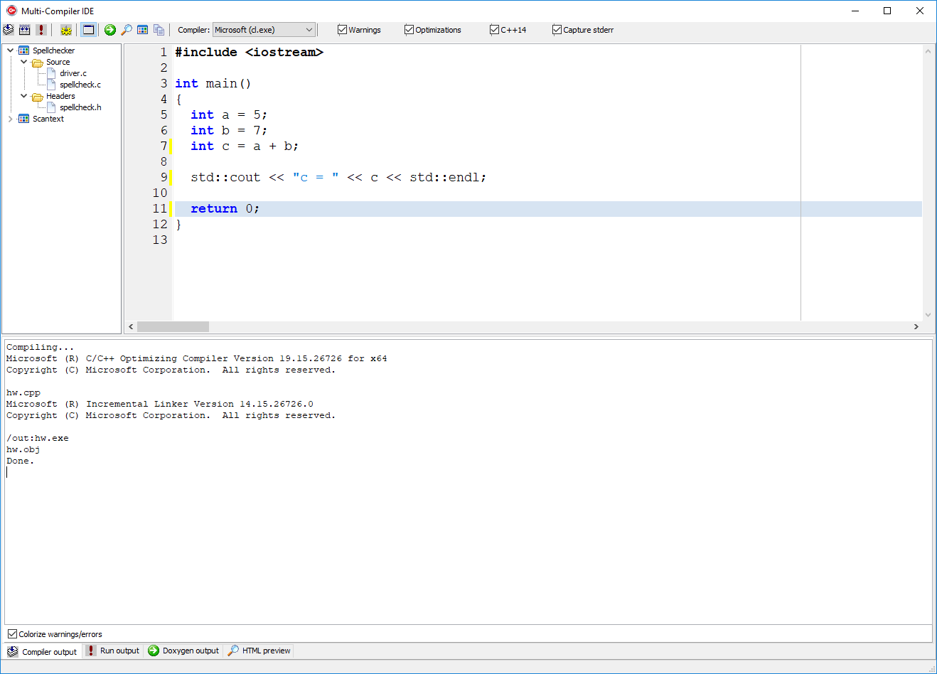Building the code using GNU g++ (with warnings/errors). The command-line compiler (cl.exe, gcc.exe, clang.exe, etc.) is run as a child process and its output is redirected (piped) back to the GUI, which displays it in the bottom window in the tab labeled Compiler output. Clicking the mouse on the error message in the bottom window will highlight the line in the source code in the top window.