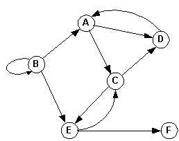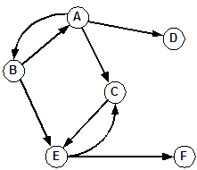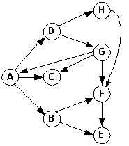 Adjacency matrix: A B C D E F G H A 0 1 1 1 0 0 0 0 B 0 0 0 0 1 1 0 0 C 0 0 0 0 0 0 0 0 D 0 0 0 0 0 0 1 1 E 0 0 0 0 0 0 0 0 F 0 0 0 0 1 0 0 0 G 1 0 1 0 0 1 0 0 H 0 0 0 0 0 1 0 0