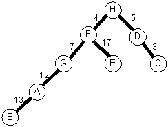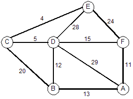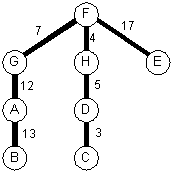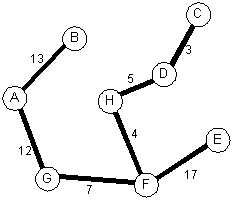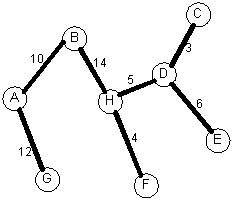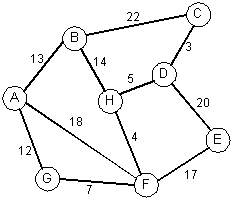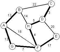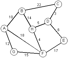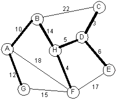 Priority queueEdge Weight ---- ------ C-D 3 H-F 4 H-D 5 D-E 6 A-B 10 A-G 12 B-H 14 G-F 15 F-E 17 A-F 18 B-C 22 |