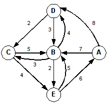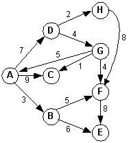 Adjacency matrix: A B C D E F G H A 0 3 9 7 0 0 0 0 B 0 0 0 0 6 5 0 0 C 0 0 0 0 0 0 0 0 D 0 0 0 0 0 0 4 2 E 0 0 0 0 0 0 0 0 F 0 0 0 0 8 0 0 0 G 5 0 1 0 0 4 0 0 H 0 0 0 0 0 8 0 0