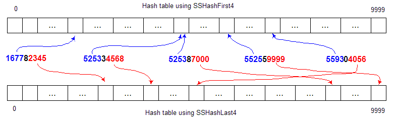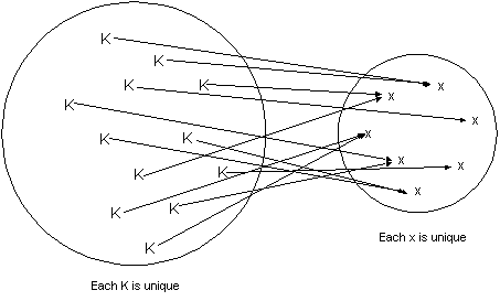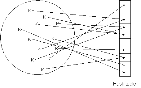 | Mapping a larger set into a smaller set: | Mapping into a hash table: |
