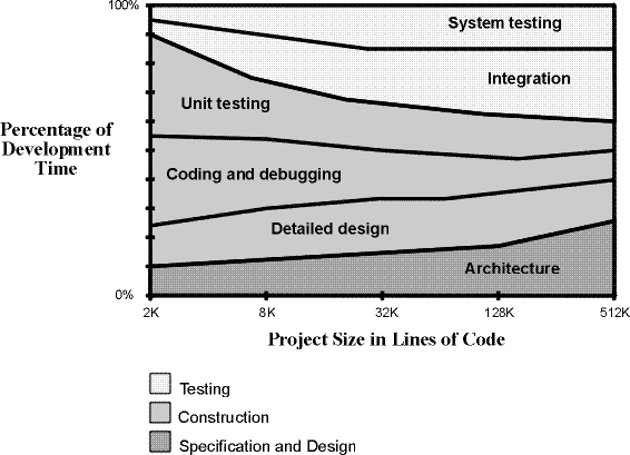 - The time spent on different kinds of development activities changes as the size of the project changes.