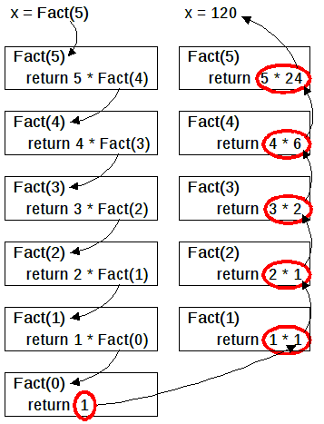 Some other values:5! = 5 * 4! = 5 * (4 * 3!) = 5 * (4 * (3 * 2!)) = 5 * (4 * (3 * (2 * 1!))) = 5 * (4 * (3 * (2 * (1 * 0!)))) (we've hit the base case) = 5 * (4 * (3 * (2 * (1 * 1)))) = 5 * (4 * (3 * (2 * 1))) = 5 * (4 * (3 * 2)) = 5 * (4 * 6) = 5 * 24 = 120
