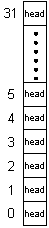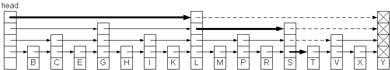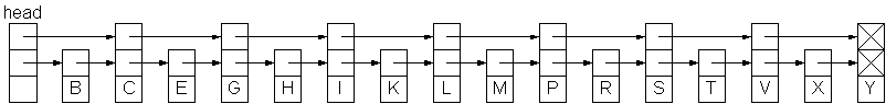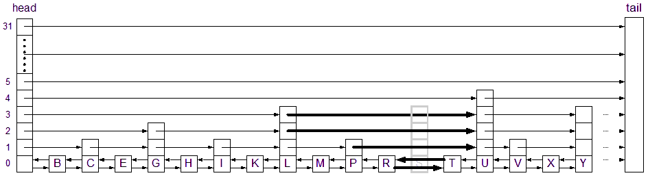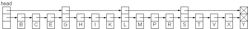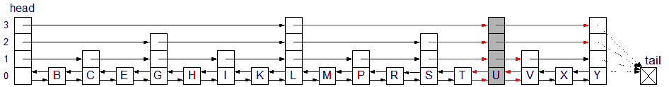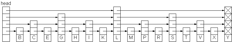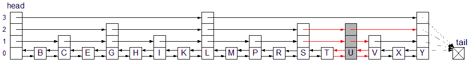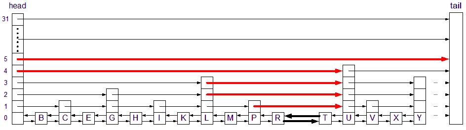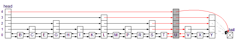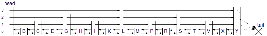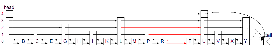 The head node still requires all levels (not shown above) because it is pointing at other nodes. The tail node points at nothing. It is merely being pointed at by the other nodes and is used as a sentinel, marking the end. (Sometimes, using a separate tail-pointer can lead to simpler code.)![]()