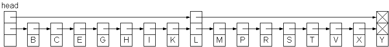If we create some nodes with 2 pointers, we can have them point "further" into the list, say 2 nodes ahead. This let's us traverse 2 nodes at a time, effectively cutting the number of node traversals in half. We would look at C, G, I, L, P, S, V then "back up" to S, and then traverse the "normal" pointer to reach T.![]()