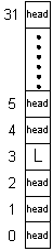 MaxLevel is currently set to 4. This is the level where the search for S will begin from the head node. Assume we have a method called locate that is used to find a node, or the position in the list where a new node will go. The method must keep track of the affected nodes. In this case, the SLNodeArray will contain pointers to head, head, L, L, P, R. These pointers will reside at index 5 through 0, respectively. Assuming a function called locate, which locates the position for the new node and fills in an array called BeforeNodes, this is what the BeforeNodes array should look like:![]()