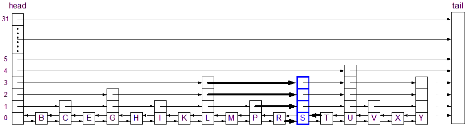 As with inserting, we need to first locate the position where S resides in the list.Assuming we added a level 3 node: The thick black lines represent pointers in nodes that WILL be affected by the deletion. Notice that the number of pointers affected is different for the delete operation. Unlike with insertion, we know exactly which pointers will be affected because we know the size (level) of the node being deleted.
