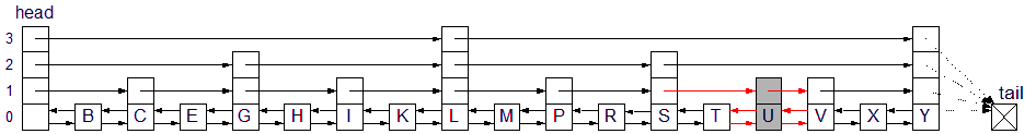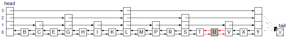 Setting the pointers is as simple as copying the values from the deleted node, S in this case, to the affected nodes. This is done by copying the level 3 pointer to node L (at level 3), copying the level 2 pointer to node L, copying the level 1 pointer to node P, and copying the level 0 pointer to node R. The last step is to copy the previous pointer from S to the previous pointer in T.![]()