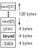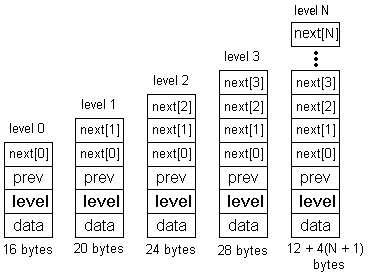 Since most (94%) of the nodes are less than level 4, this wastes far too much memory.node = new SLNode; // allocates 140 bytes for all nodes in the list