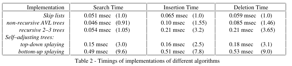 Also from the paper: Implementation difficulty - For most applications, implementers generally agree skip lists are significantly easier to implement than either balanced tree algorithms or self-adjusting tree algorithms.
