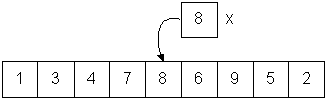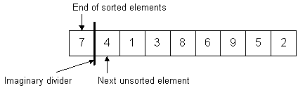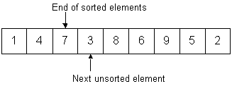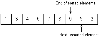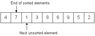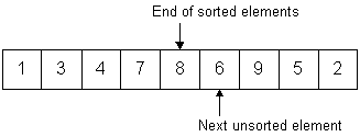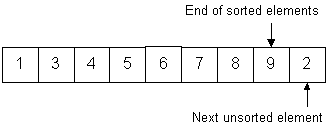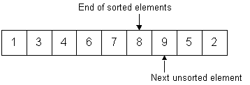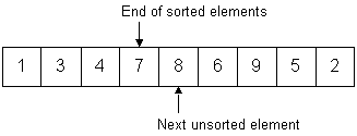 The idea behind the insertion sort is that you start with a sorted list and continually insert the next element into its proper position in the sorted list. Sounds like a chicken-or-the-egg thing, but it's not. So, how do we start with a sorted list (since that's our end goal)? Simple, we consider the first element in the unsorted list to be a list of one. By definition, a list with only one element is already sorted. (Think about it.) So, what we have is our original list that is partitioned into two lists: a sorted portion and an unsorted portion. The sorted portion is in the front of the list, and the unsorted portion is in the back of the list. For example, if we have 9 elements in our list, the sorted portion consists of the first element (in the front) and the unsorted portion consists of the remaining 8 elements (at the end).
