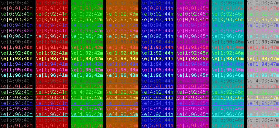 Attributes Foreground color Background color 00 = normal 01 = bold 04 = underlined 05 = blinking 07 = reversed 08 = concealed 31 = red 32 = green 33 = orange 34 = blue 35 = purple 36 = cyan 37 = grey 90 = dark grey 91 = light red 92 = light green 93 = yellow 94 = light blue 95 = light purple 96 = turquoise 40 = black 41 = red 42 = green 43 = orange 44 = blue 45 = purple 46 = cyan 47 = grey 100 = dark grey 101 = light red 102 = light green 103 = yellow 104 = light blue 105 = light purple 106 = turquoise