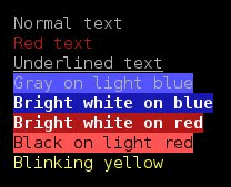The above lines will output like this (in a terminal that supports color):printf '\e[0mNormal text\e[m\n' printf '\e[31mRed text\e[m\n' printf '\e[4mUnderlined text\e[m\n' printf '\e[37;104mGray on light blue\e[m\n' printf '\e[1;37;44mBright white on blue\e[m\n' printf '\e[1;37;41mBright white on red\e[m\n' printf '\e[0;30;101mBlack on light red\e[m\n' printf '\e[5;93mBlinking yellow\e[m\n'